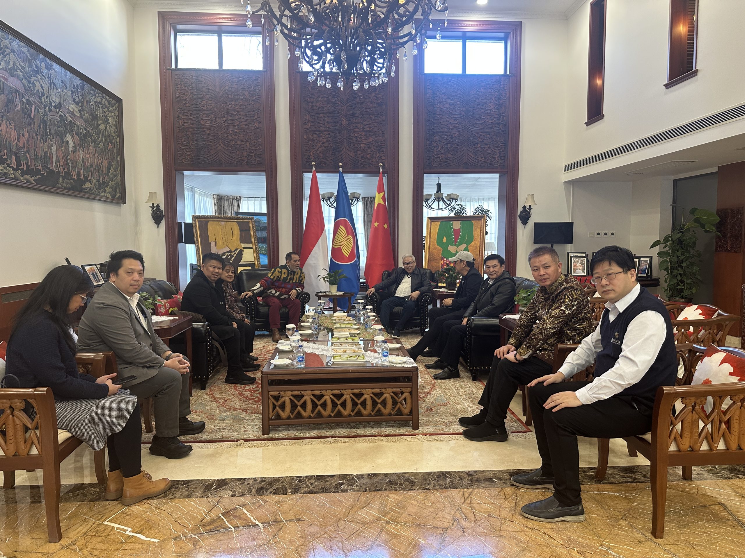 印尼驻华大使 H.E. Djauhari Oratmangun 阁下携副大使 Irene、经济参赞 Dita、投资参赞 Rizaldi、政治处 Dewi、顾问 Lebit 等使馆核心成员共同参与会见。双方围绕中印尼在经贸、投资与产业合作等领域的发展机遇展开了务实而深入的对话,并就加强政策沟通、优化投资环境、促进重点项目对接等方面提出了具有建设性的意见与建议。