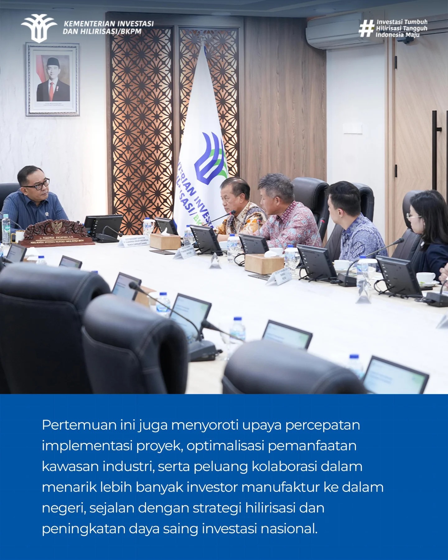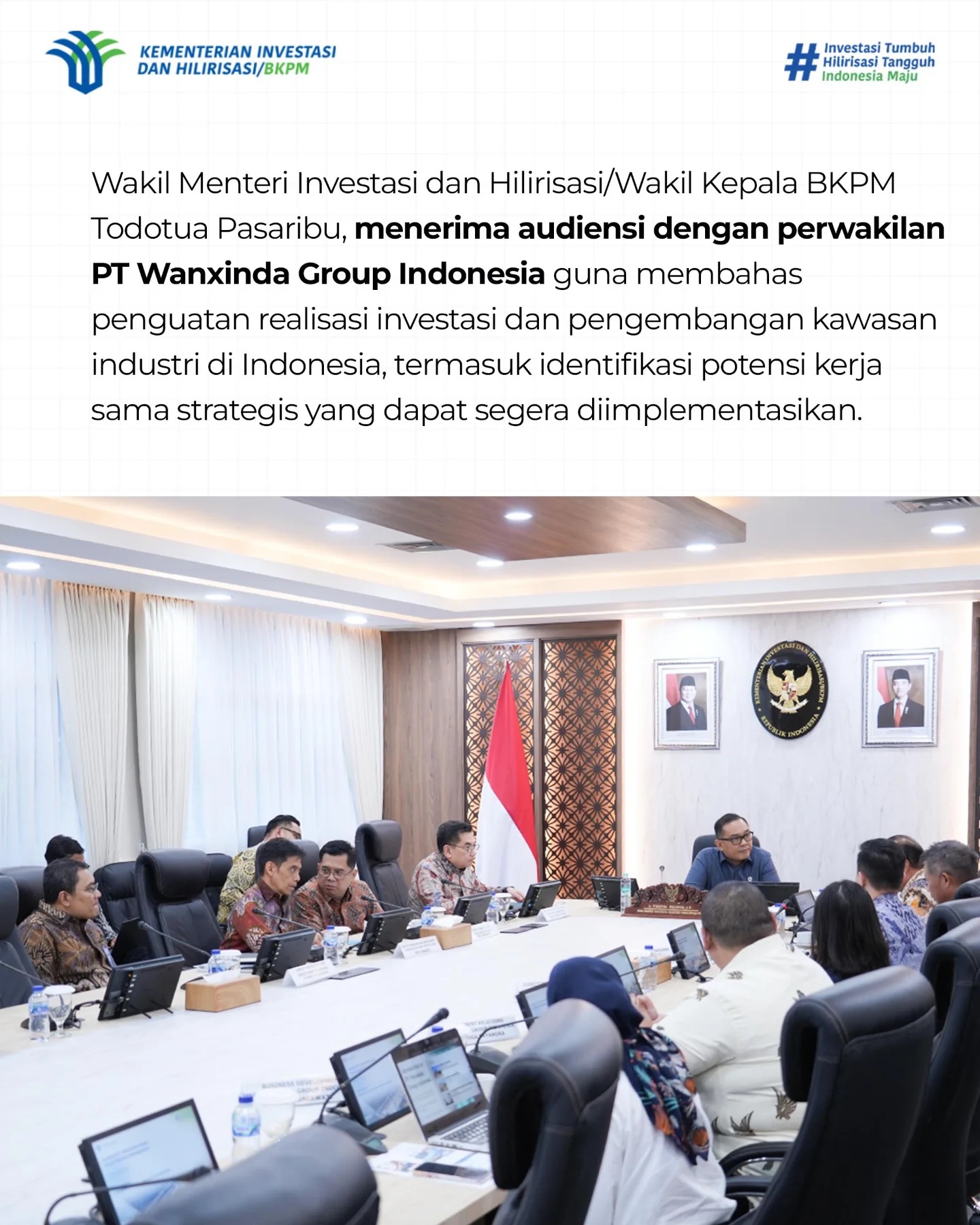 2026年4月14日(星期二),印尼万信达集团代表团前往印尼投资协调委员会(BKPM),受到投资与下游化副部长、BKPM副主任Todotua Pasaribu先生的亲切接见。双方围绕深化政企协同、推动工业园区高质量发展、加快重点领域下游化进程等核心议题,展开了深入务实的会谈。